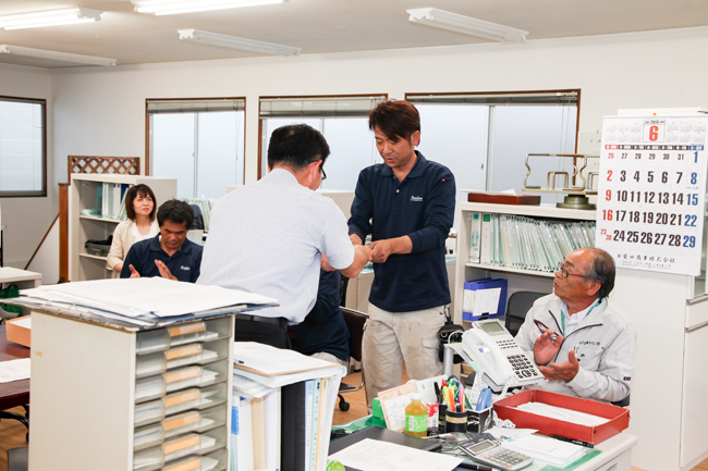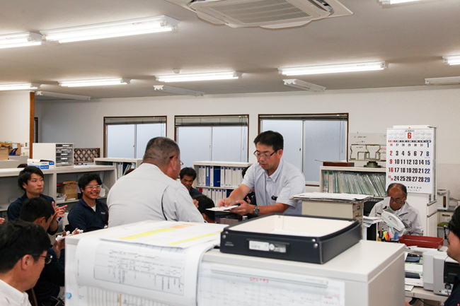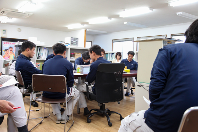 2019年6月26日 日伸テクノ全社員が集まり定例会議を行いました 日伸テクノでは月に1度必ず全社員が集まり、 定例会議を行っております。 安全第一で事故0を目指すために、社員全員で目標や意識を共有して、 日伸テクノとして良い環境を作っていきたいと思っております。