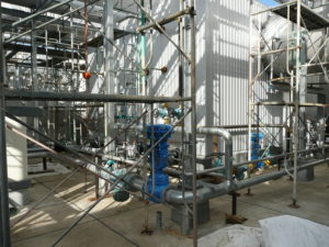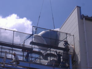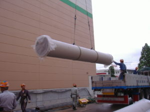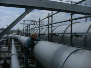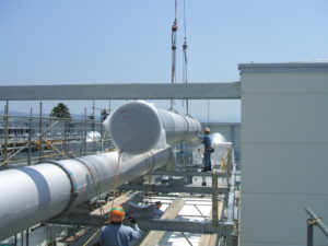 (工場内)用力設備に伴う配管工事 施工内容 用力設備配管工事、排気ダクト配管工事 施工場所 熊本県 (某工場新築) 工期 10か月 施工内容詳細 工場新築に伴う冷凍機械室内でのユーティリティ配管工事スタンション上でのガス排気用ステンレスダクト配管工事を行いました。 ダクト搬入 ダクト勾配確認